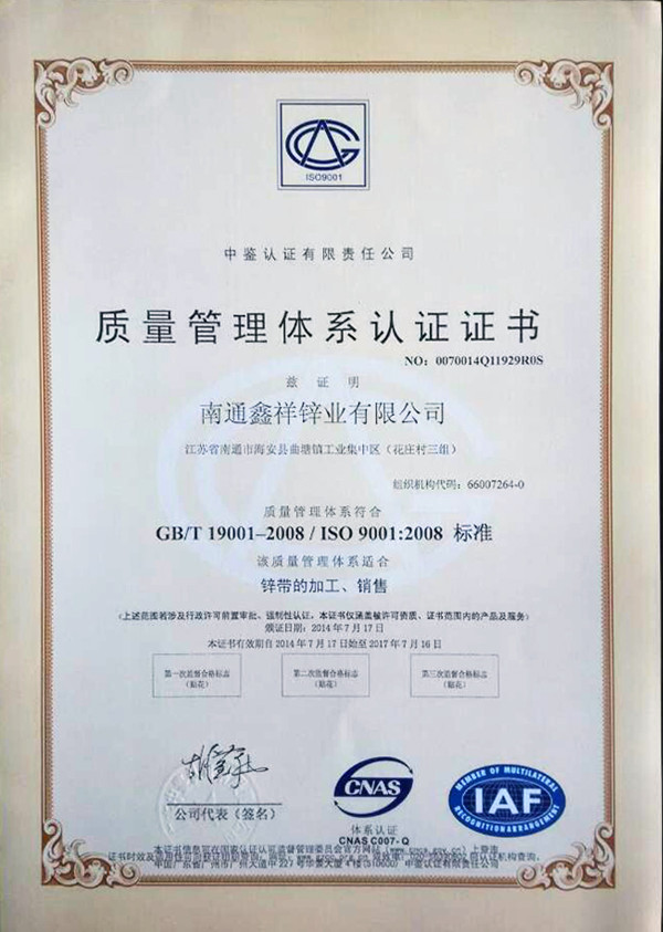 鑫祥鋅業(yè)正式取得ISO9001質(zhì)量管理體系的認證證書。